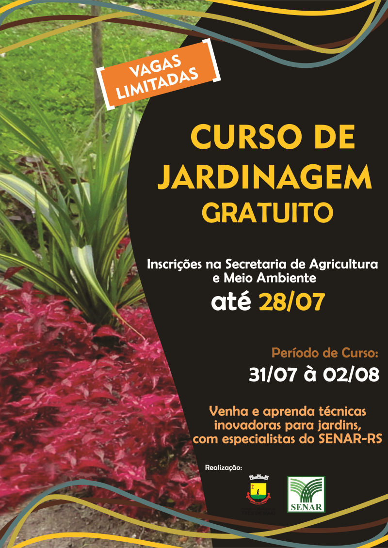 Já estão abertas as inscrições para um Curso de Jardinagem Gratuito, através de um projeto promovido pela Secretaria de Agricultura e Meio Ambiente, Secretaria de Políticas da Mulher, Secretaria de Desenvolvimento Social e Secretaria de Obras, em parceria com o Serviço Nacional de Aprendizagem Rural - SENAR. O curso é destinado ao público em geral que queira ampliar seus conhecimentos na área de jardinagem. O curso é gratuito.