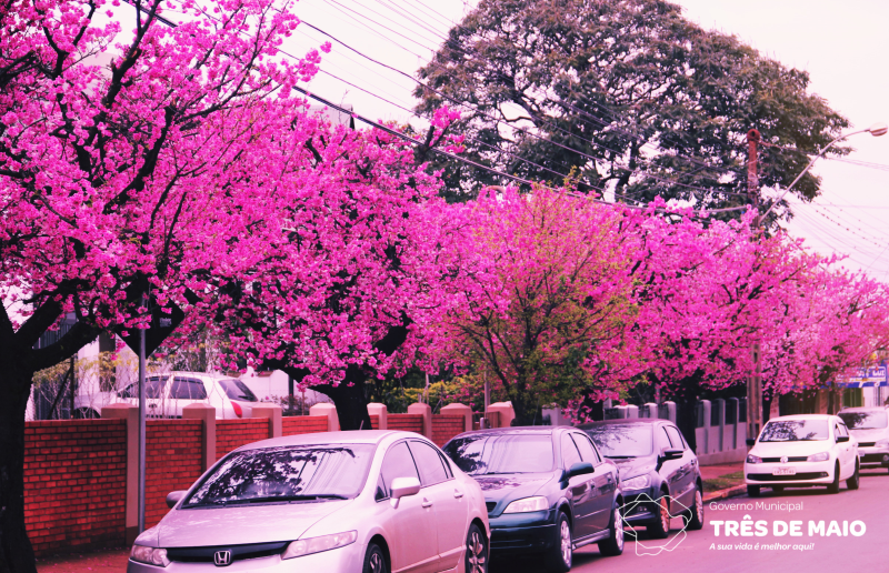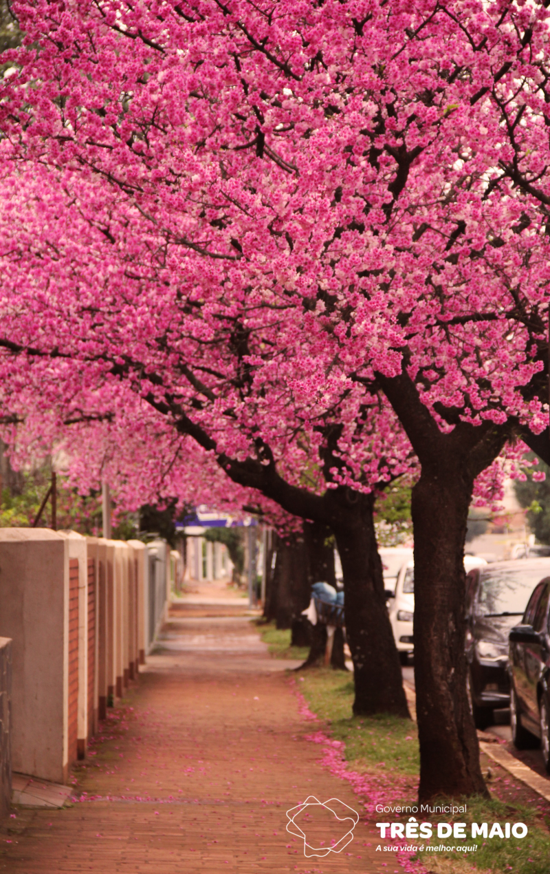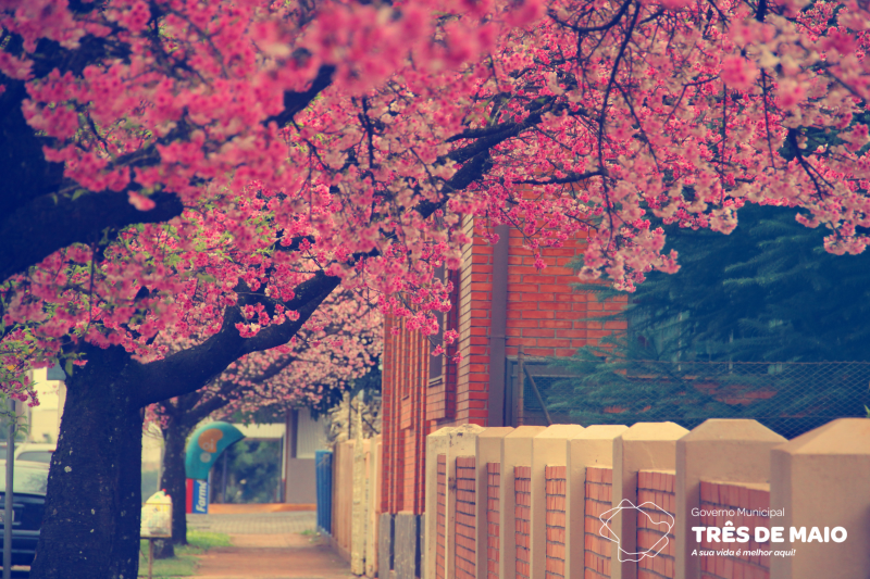 Nos últimos dias, a paisagem fria da cidade ganhou um toque rosado e com formas delicadas. É a florada da Cerejeira do Japão que chama atenção nas ruas de Três de Maio.