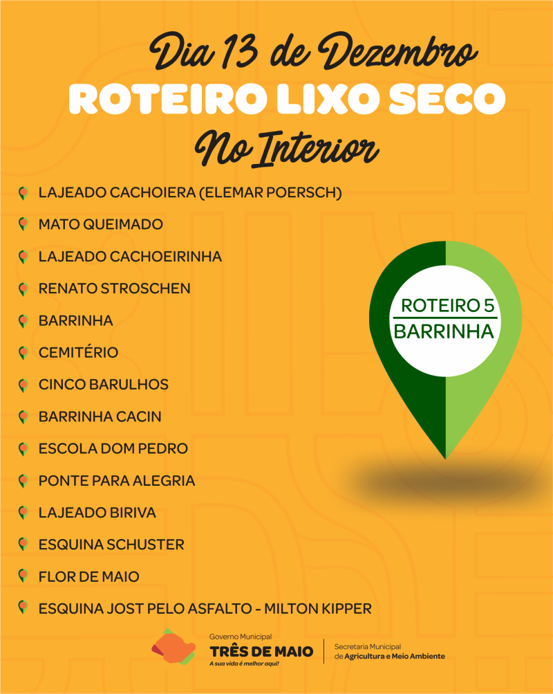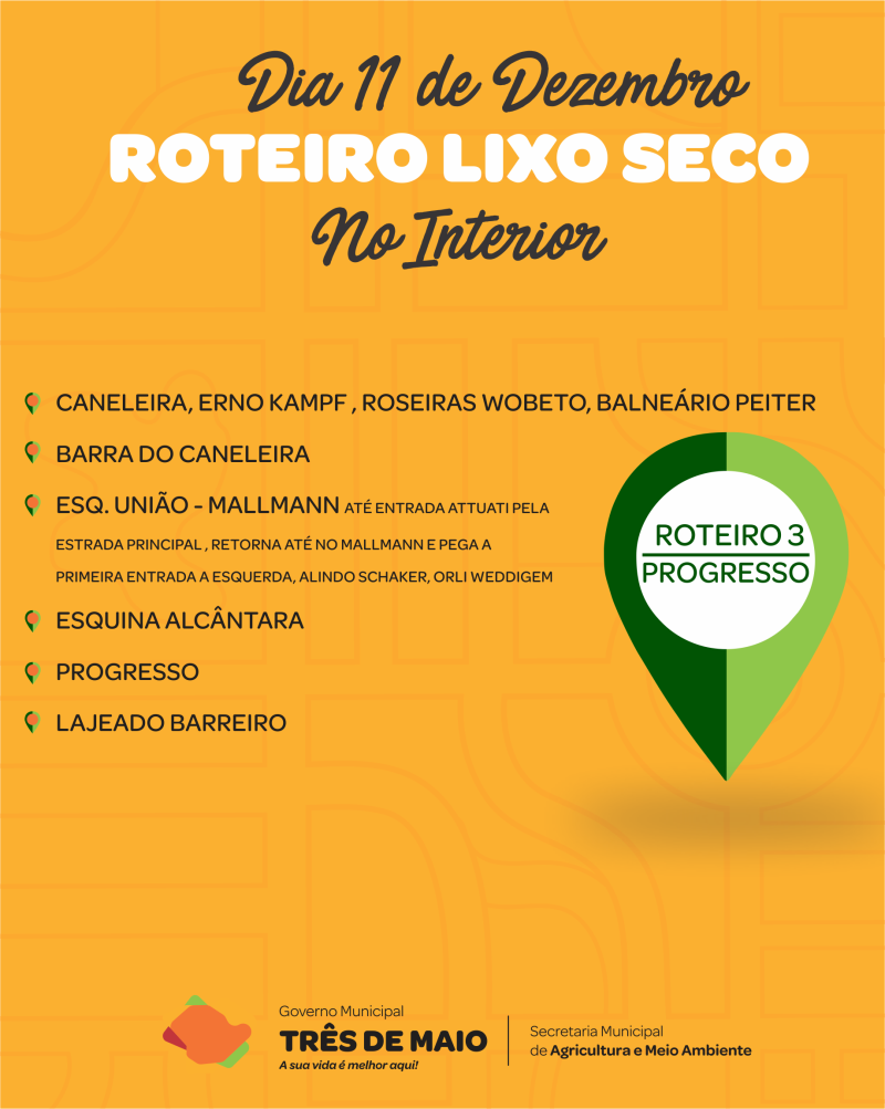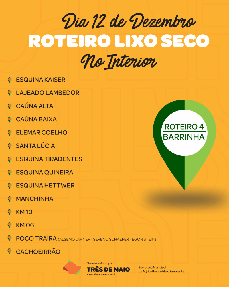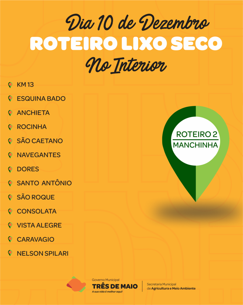 Realizado pela Secretaria Municipal de Agricultura e Meio Ambiente, a coleta do lixo seco no interior do município será realizada entre os dias 9 e 13 de dezembro, conforme o cronograma.