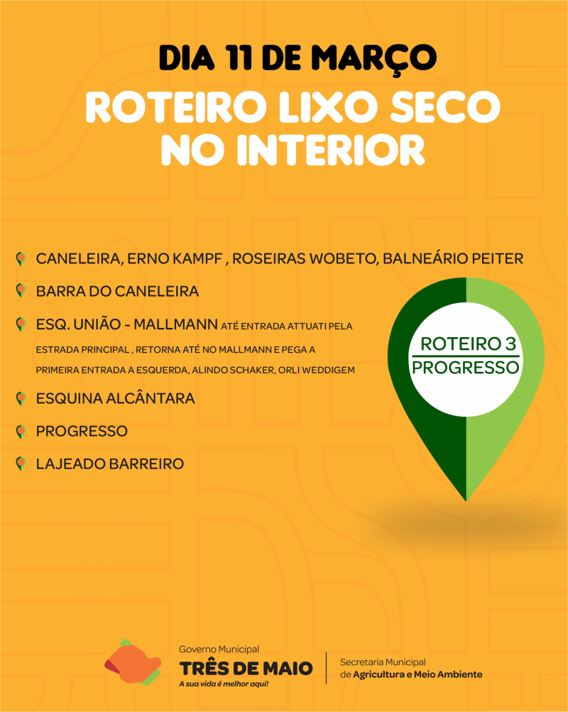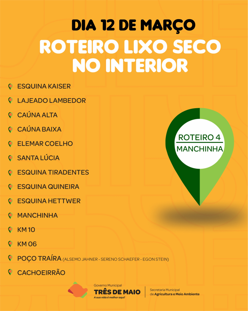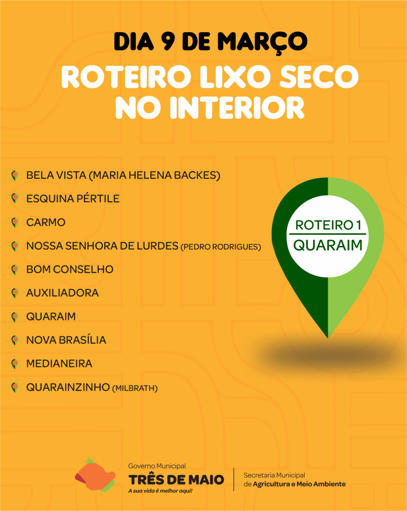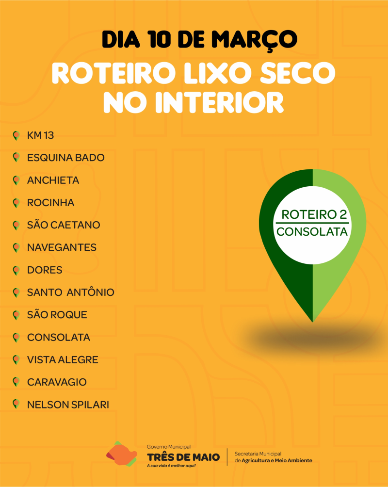 Realizado pela Secretaria Municipal de Agricultura e Meio Ambiente, a coleta do lixo seco no interior do município será realizada entre os dias 9 e 13 de março, conforme o cronograma.