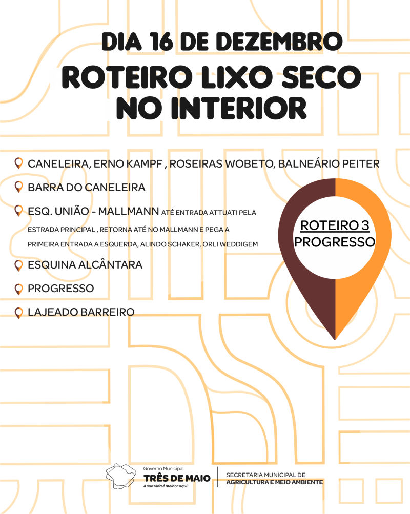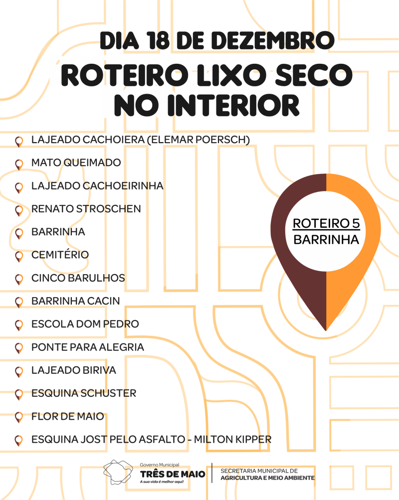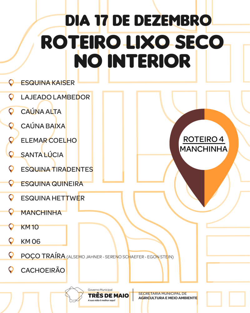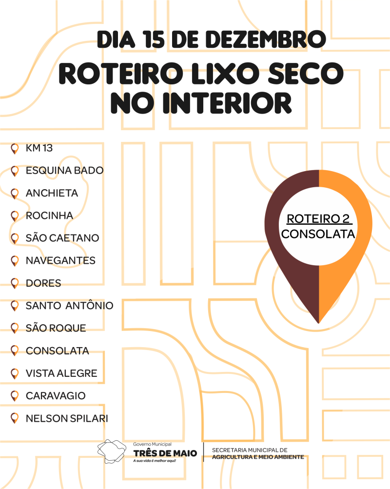 Realizado pela Secretaria Municipal de Agricultura e Meio Ambiente, a coleta do lixo seco no interior do município será realizada entre os dias 14 e 18 de dezembro, conforme o cronograma.