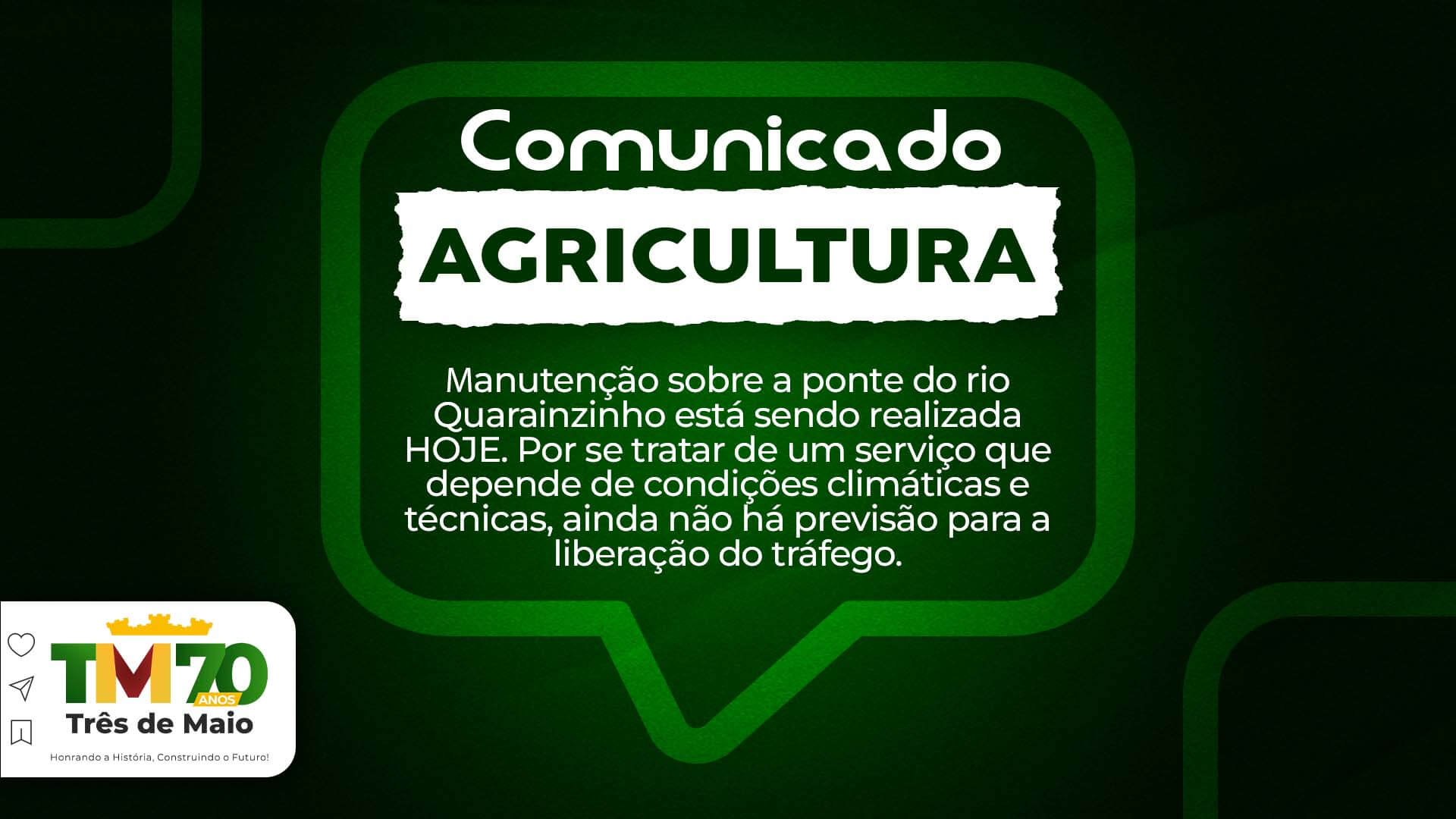 O Governo Municipal de Três de Maio, por meio da Secretaria de Agricultura, informa que o trajeto localizado após a entrada do Caça e Pesca, sobre o Rio Quarainzinho, está temporariamente interrompido para obras de manutenção e reparos na ponte.