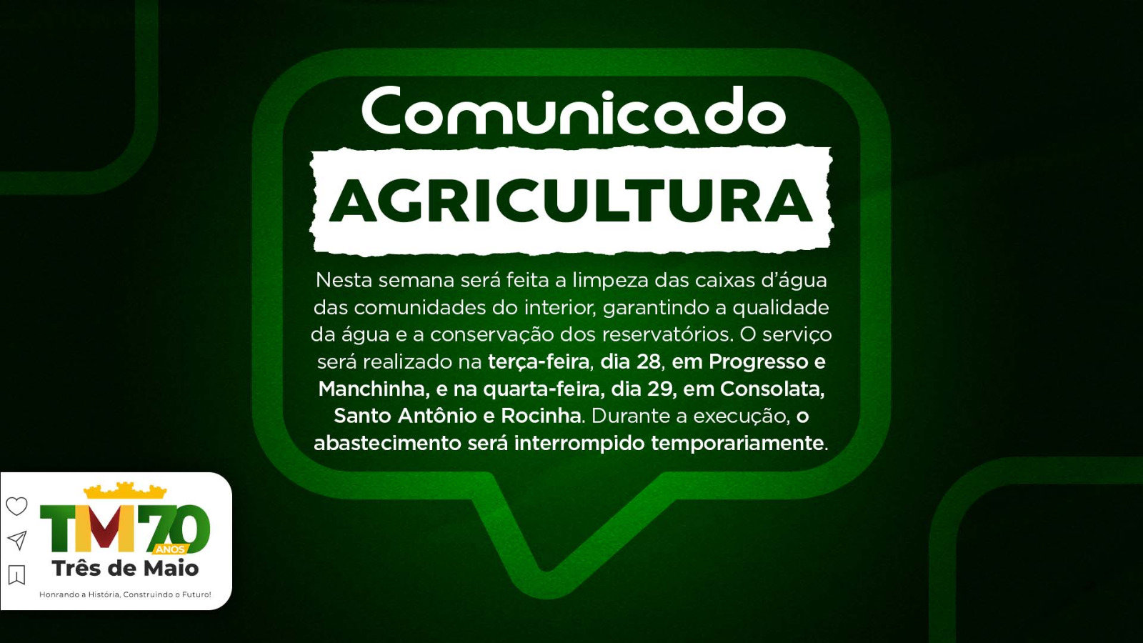 O Governo Municipal de Três de Maio, por meio da Secretaria de Agricultura, informa que será realizada nesta semana a higienização das caixas d’água das comunidades do interior. A iniciativa tem como objetivo garantir a qualidade da água distribuída às famílias e a manutenção adequada dos reservatórios.