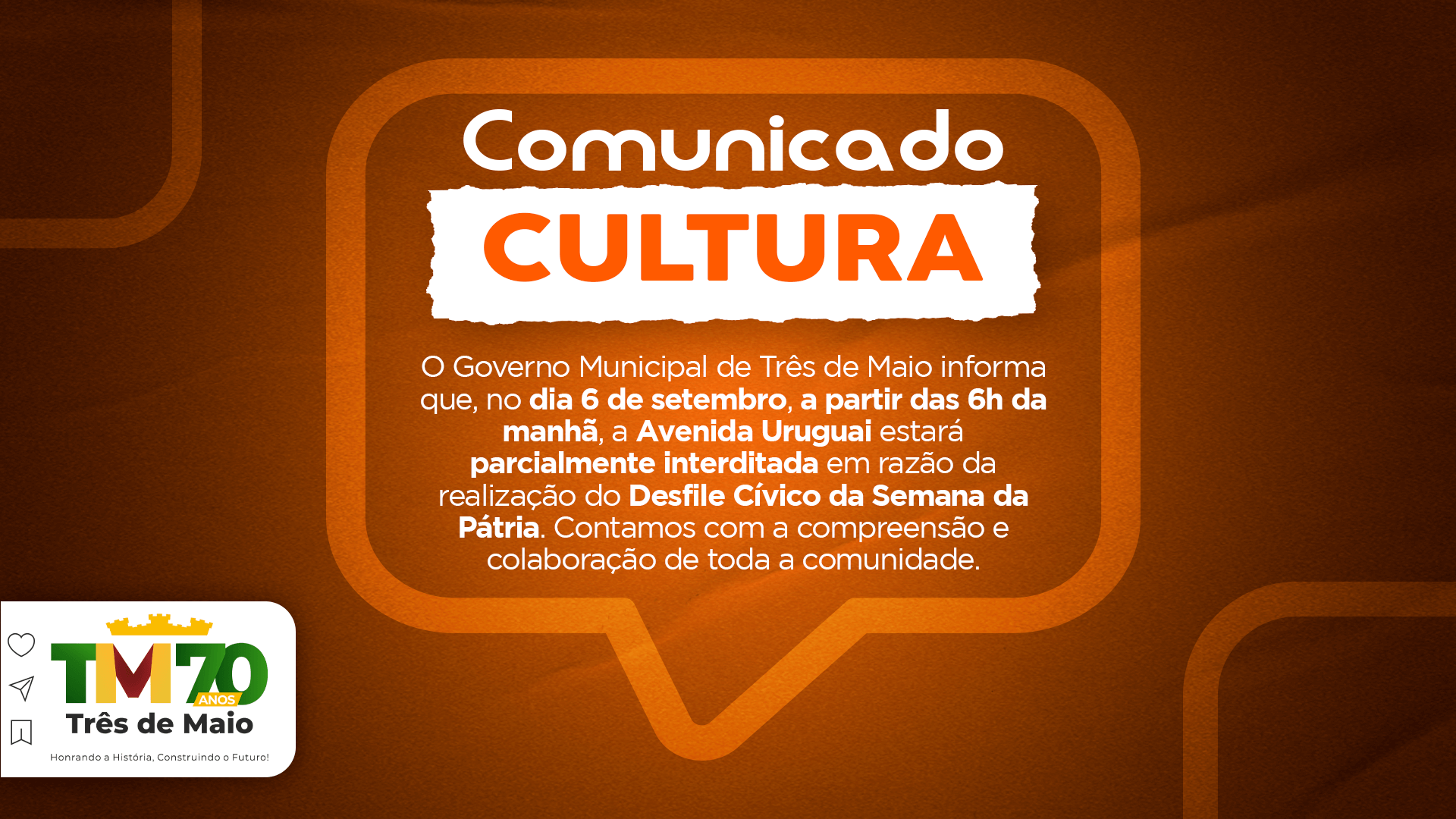 O Governo Municipal de Três de Maio, por meio da Secretaria de Cultura e Turismo, informa que no dia 06 de setembro, a partir das 6h da manhã, a Avenida Uruguai estará parcialmente interditada no trecho que vai da rótula Willig até a Igreja Matriz Católica, em razão da realização do Desfile Cívico da Semana da Pátria.