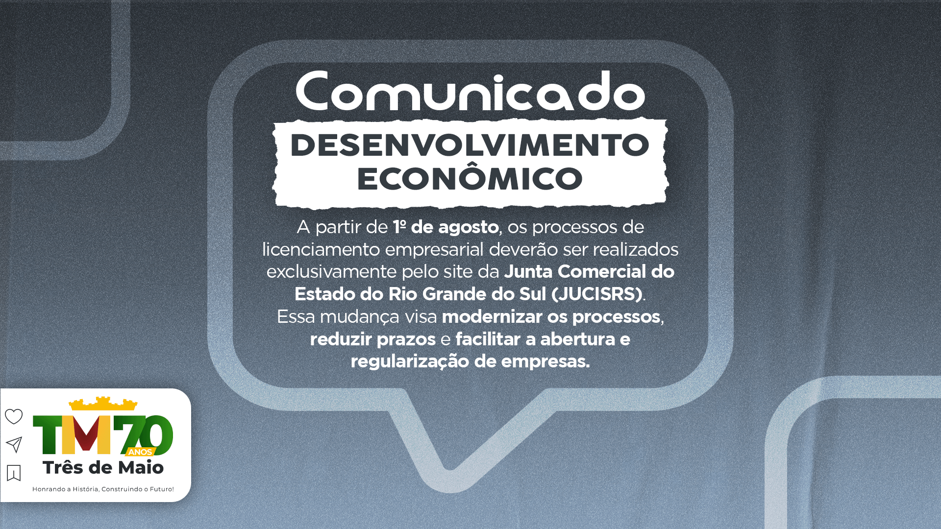 O Governo Municipal de Três de Maio, por meio da Secretaria de Desenvolvimento Econômico, informa que, a partir do dia 1º de agosto de 2025, todos os processos de licenciamento empresarial no município deverão ser realizados exclusivamente pelo site da Junta Comercial do Estado do Rio Grande do Sul (JUCISRS), disponível em https://jucisrs.rs.gov.br/inicial.