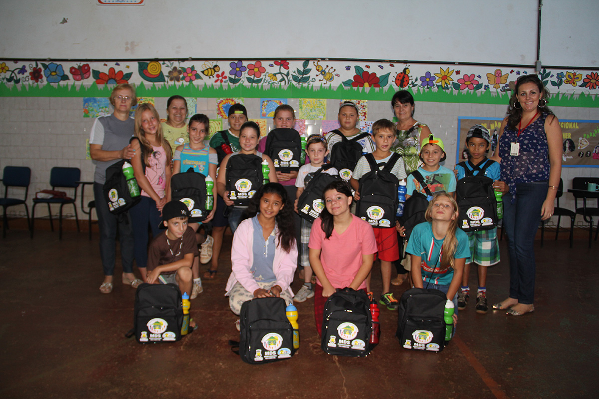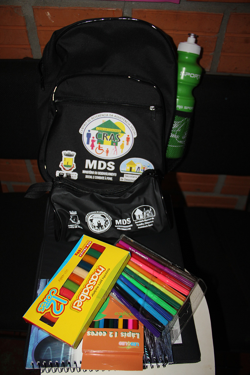 O kit entregue estava composto por caderno, estojo, canetas, lápis de cor, canetinhas, régua, tesoura, borracha, cola, apontador, massa de modelar, giz de cera e pasta para colocar trabalhos. Os materiais entregues são para uso nas atividades desenvolvidas nos projetos e a mochila também pode ser utilizada na escola.