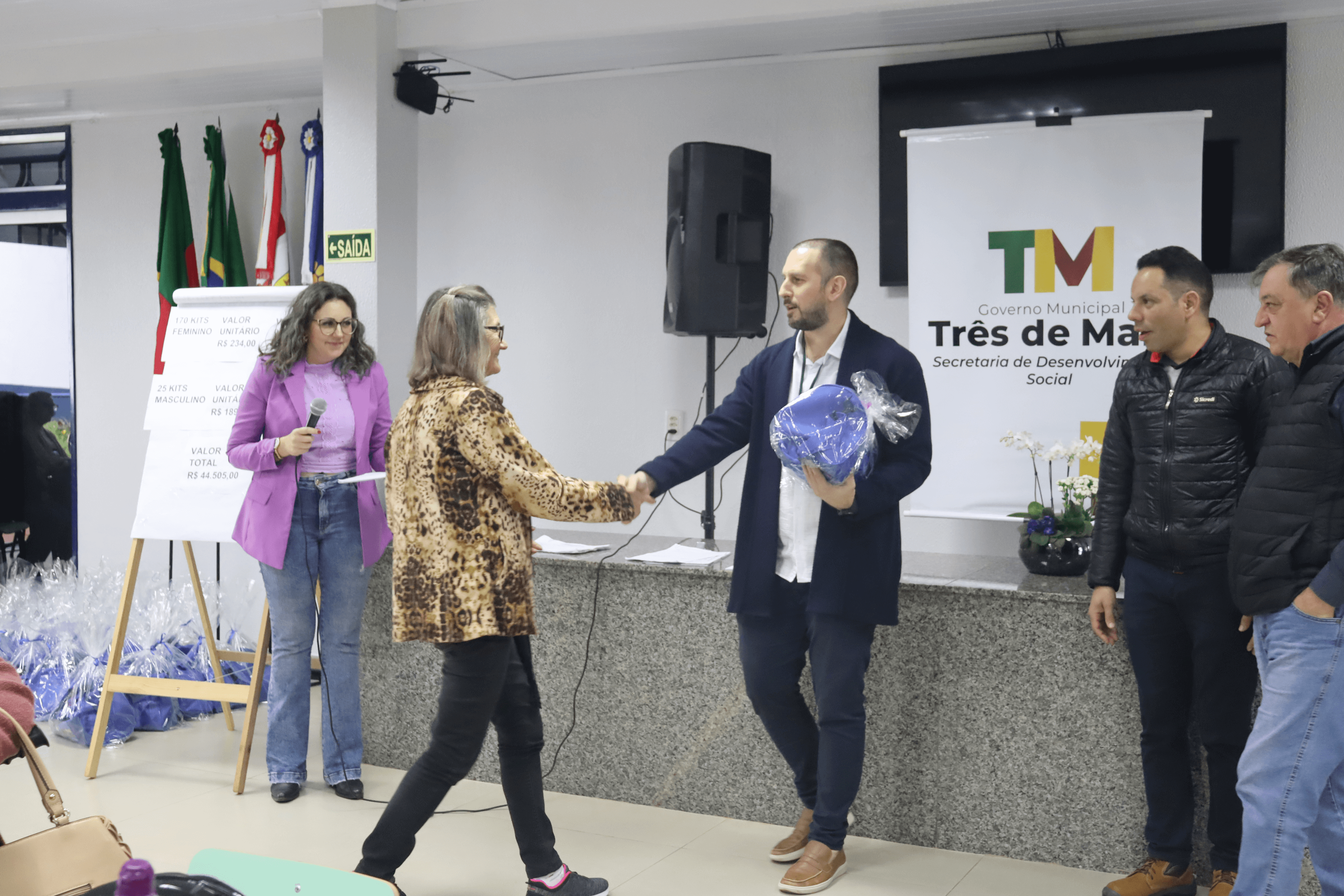 Na tarde do dia 27 de julho, o Governo Municipal com a parceria da Câmara de Vereadores de Três de Maio, realizou a entrega de kits de hidroginástica aos idosos que realizam a atividade.