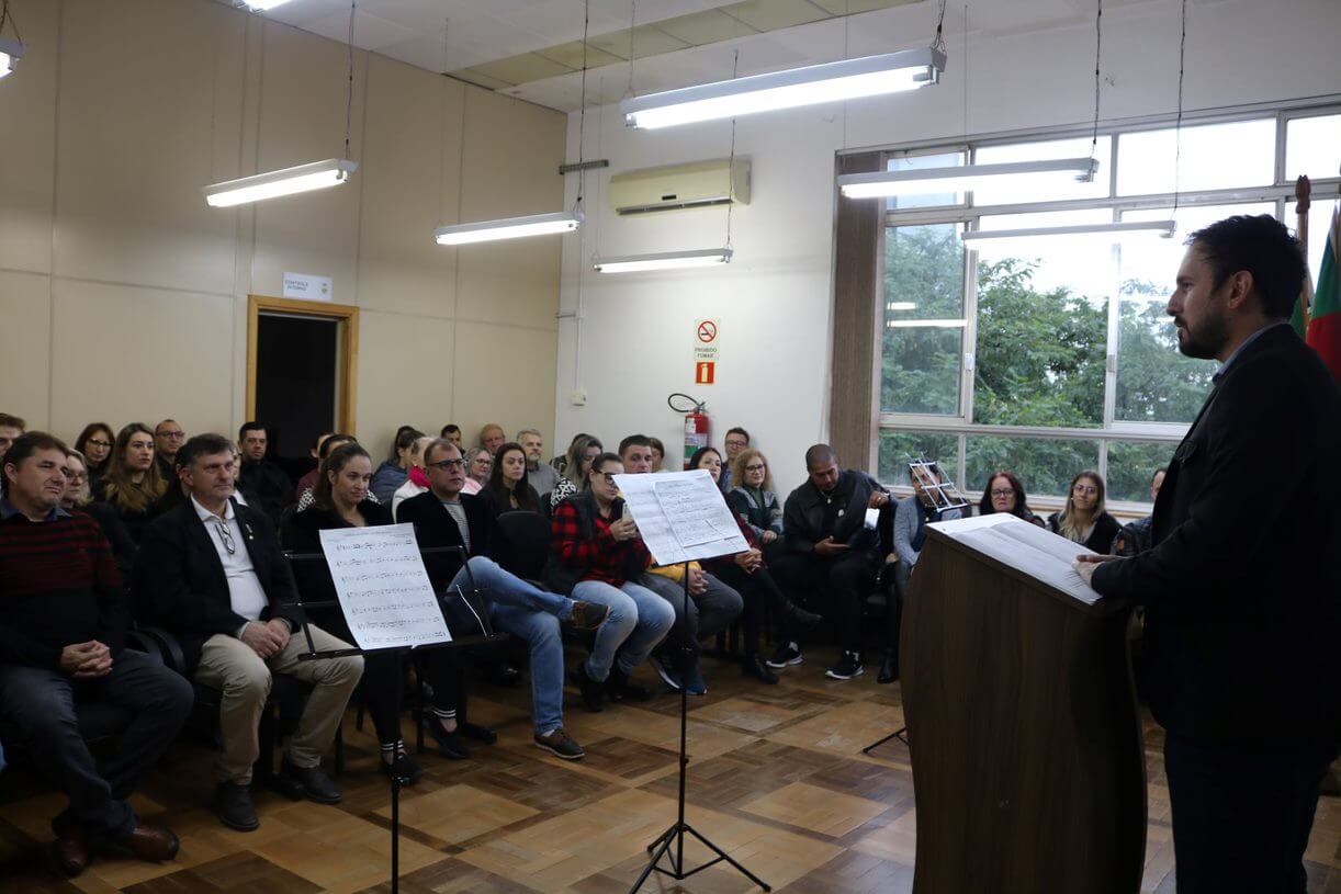A solenidade foi encerrada com o Hino do Rio Grande do Sul, que foi entoado pelo aluno Muriel de Rosso Dias, acompanhado pelo estudante Alex Lavarda Weber.