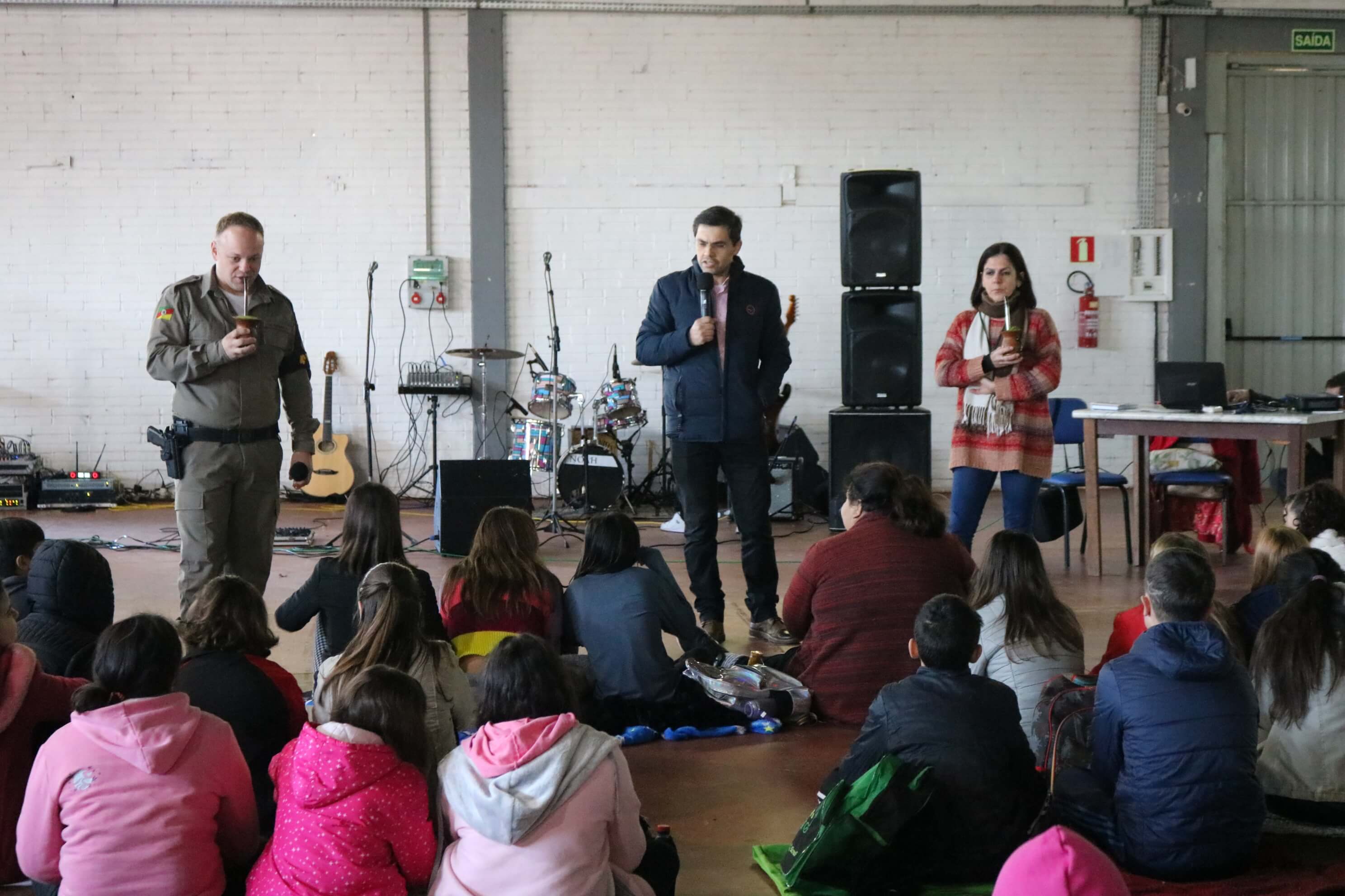 Os alunos foram recepcionados pela Secretária de Educação e pela Coordenadora de Cultura, posteriormente tiveram uma conversa com o tema "DROGAS - ESTOU FORA!", realizada pelo Soldado Michael Sdruikoski e pelo Enfermeiro Paulo Pereira. Também foi realizado um momento de comemoração com a Banda Félix & GabLuiz, com muita descontração e pipoca.
