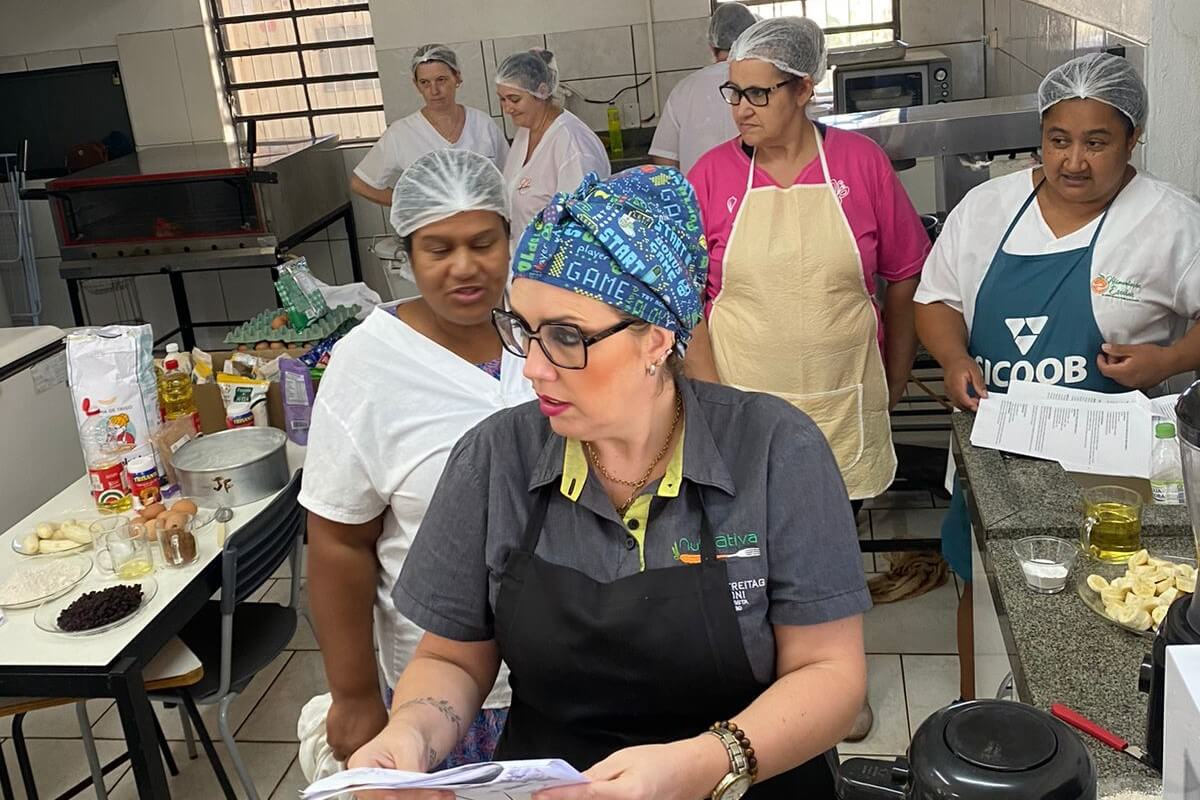 O treinamento aconteceu na EMEF Germano Dockhorn, durante os dias 11 e 12 de março, com as cozinheiras da rede municipal de ensino para compor os cardápios escolares com bolos mais saborosos, nutritivos e o aproveitamento de alimentos.