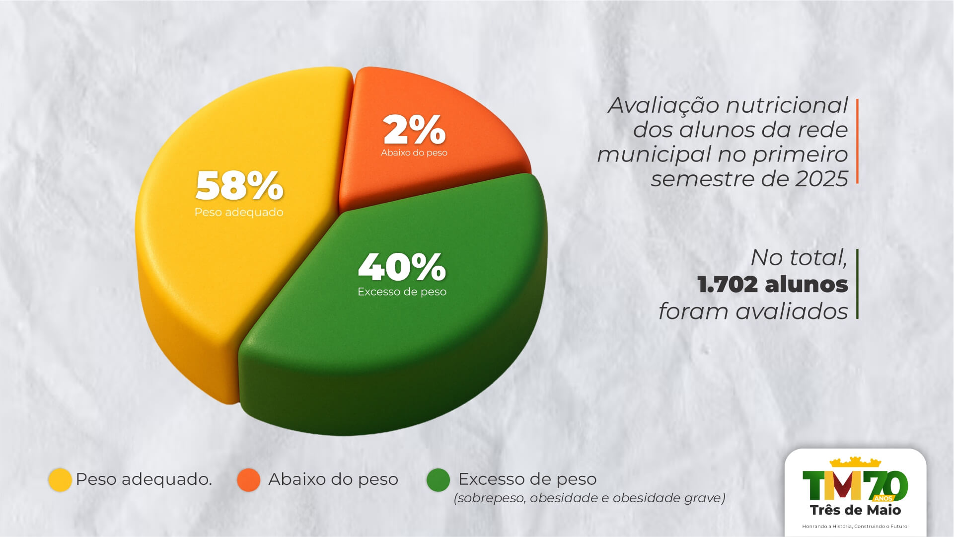 No total, 1.702 alunos foram avaliados. Os resultados mostram que 58% estão com peso adequado para a idade, enquanto 40% apresentam excesso de peso, incluindo sobrepeso, obesidade e obesidade grave. Apenas 2% se encontram abaixo do peso.