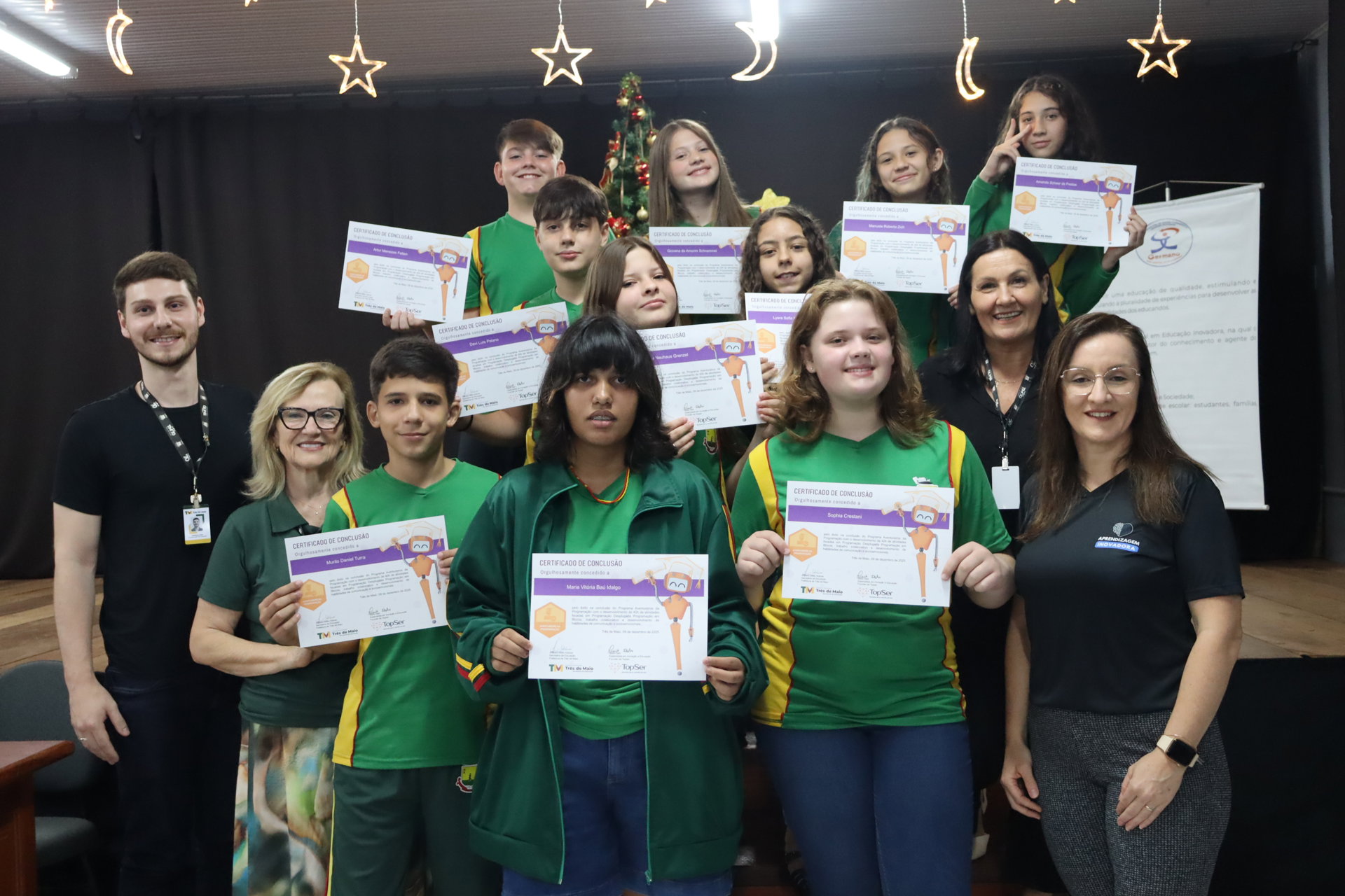 A comunidade escolar viveu um momento especial na noite de ontem, 9 de dezembro, com a formatura do Programa Aventureiros da Programação. A cerimônia ocorreu no auditório da EMEF Formatura e reuniu 133 alunos do 7º ano das escolas Germano Dockhorn, Frederico Lenz e Caminhos Inovadores.