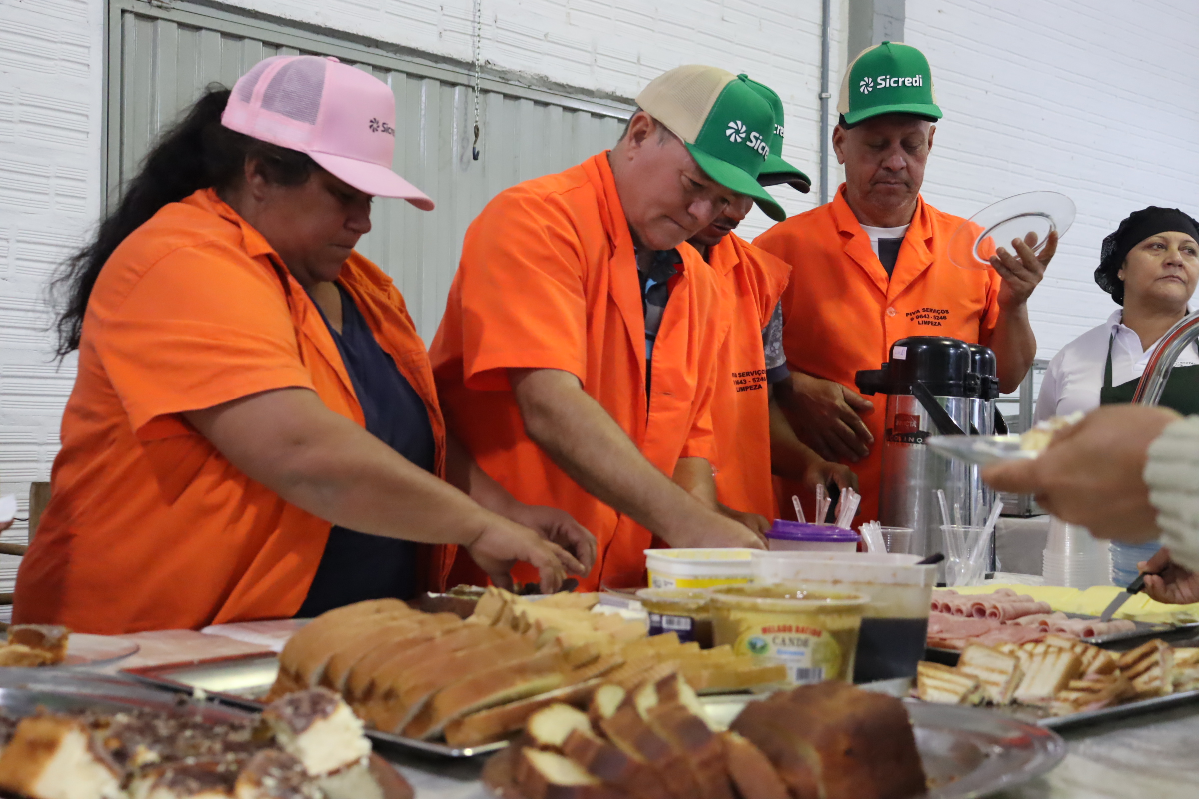 Na manhã desta quarta-feira, 7 de maio, os trabalhadores da comissão de limpeza da Expofeira 2025 foram homenageados com um café da manhã especial, promovido pelo Sicredi, como forma de reconhecimento ao trabalho essencial que realizam durante todo o evento.