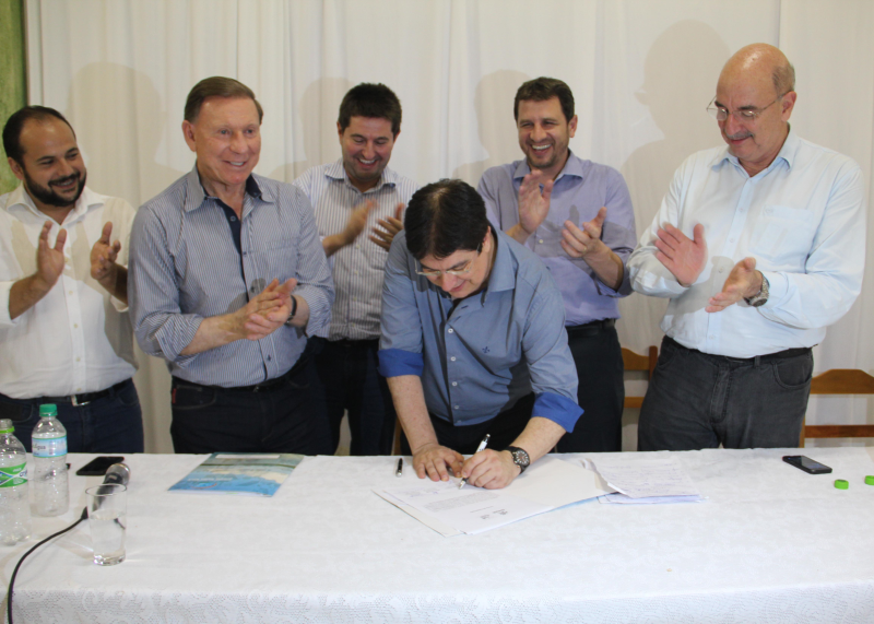 Na sequência, o secretário do Produtor Rural e Cooperativismo do MAPA, Caio Rocha, o secretário estadual de Agricultura, Pecuária e Irrigação, Ernani Polo e o presidente da AMGSR e prefeito de Três de Maio, Olívio José Casali, realizaram a assinatura do Termo de Cooperação para implantação do Laboratório de Análise e Certificação da Qualidade do Leite em Três de Maio.
