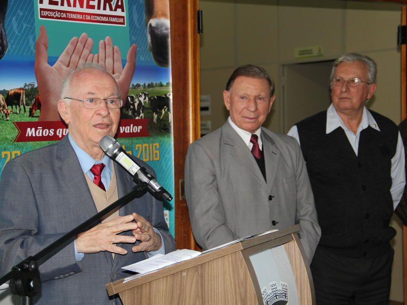 Em seguida, o vice-presidente do BRDE, representando no ato também o governador José Ivo Sartori, fez o seu pronunciamento, agradecendo a gentiliza de haverem distinguido a ele a Hospedagem Oficial e à Cotrimaio pelo presente.