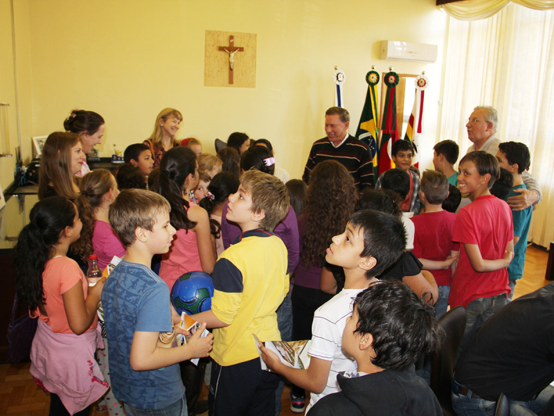 Na tarde desta terça-feira, 28, estudantes das turmas de 3º, 4º e 5º anos da Escola Estadual de Ensino Fundamental São Francisco, acompanhados dos professores Tarlene, Irlete, Daniela e Jeferson, visitaram o Palácio Municipal Walter Ullmann. No gabinete municipal, os alunos e professores foram recepcionados com alegria e entusiasmo pelo prefeito Olívio José Casali.