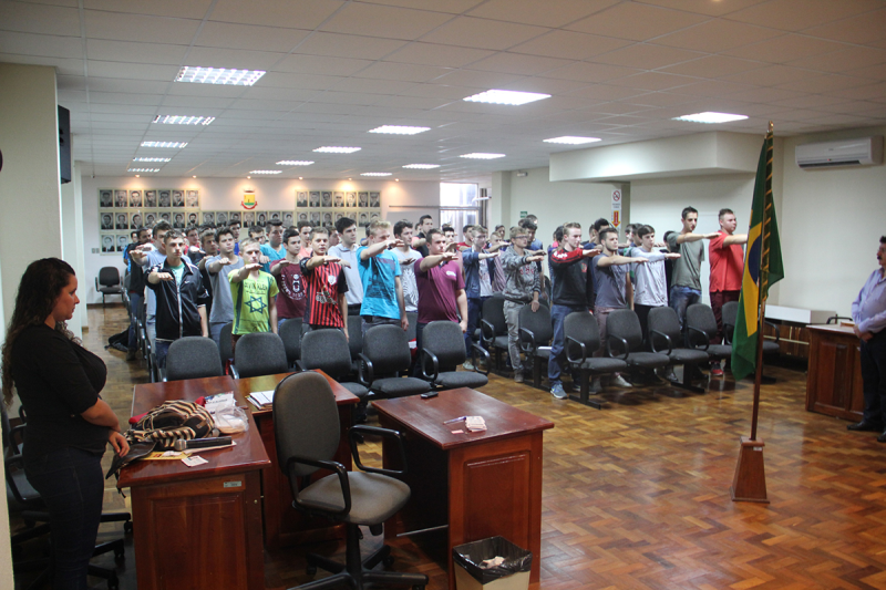 A Junta de Serviço Militar de Três de Maio, realizou na última sexta-feira, dia 26, o juramento à Bandeira para os jovens que foram dispensados do Serviço Militar Inicial. Reunidos na Câmara Municipal de Vereadores, 69 jovens em idade de alistamento fizeram seu juramento à Bandeira e receberam o certificado de dispensa do Serviço Militar em Três de Maio.