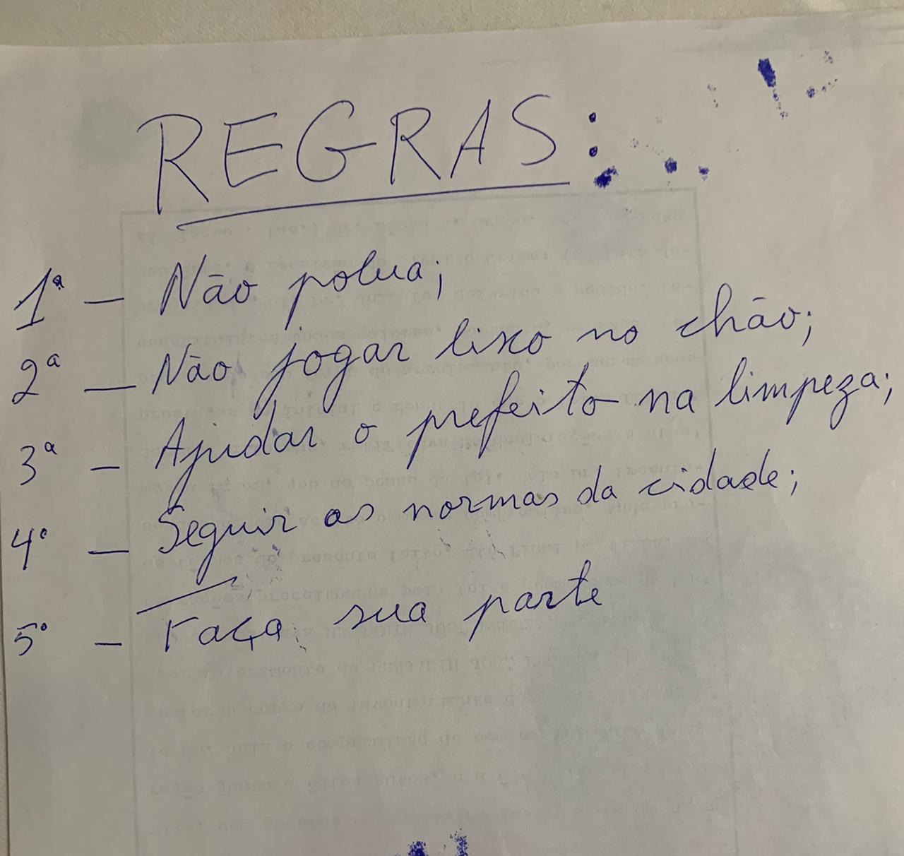 A lista da Clara, que foi entregue pessoalmente por ela ao prefeito, na tarde de quarta-feira (17), é composta pelas seguintes regras: Não poluir; Não jogar lixo no chão; Ajudar o prefeito na limpeza; Seguir as normas da cidade; Fazer a sua parte.