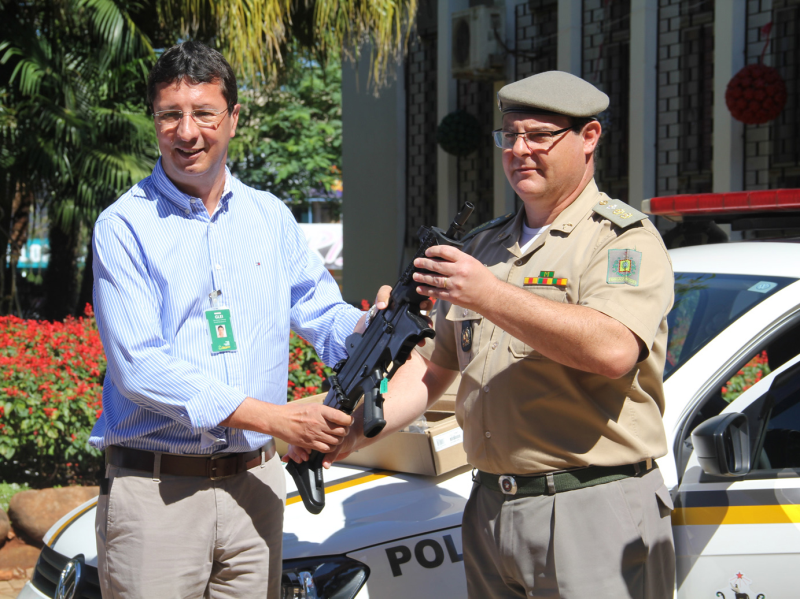 Em uso da palavra, o tenente Gilmar Daniel Feistel, destacou que Três de Maio estava carente de veículos com melhores condições e que a nova viatura e as armas servirão para melhorar a segurança do município. “Além das submetralhadoras, o efetivo da Brigada Militar municipal conta com armas calibre 12, etilômetro, arma taser e algemas. Hoje nosso efetivo está devidamente equipado, com plenas condições de trabalho”, enfatiza.