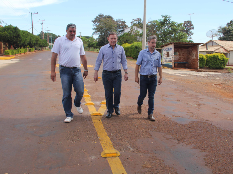 Em seguida, a comitiva vistoriou as melhorias na rua São Pedro, onde foram colocados tachões, placas e uma pequena rotatória, melhorando a sinalização do trânsito de automóveis.