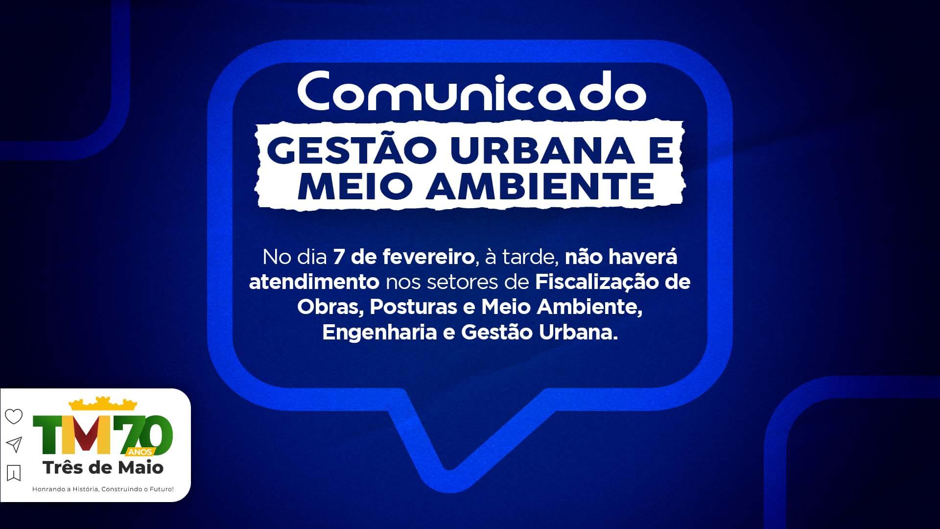 O Governo Municipal de Três de Maio, por meio da Secretaria de Gestão Urbana e Meio Ambiente, comunica que na tarde do dia 7 de fevereiro não haverá atendimento nos seguintes setores: Fiscalização de Obras, Posturas e Meio Ambiente, Engenharia e Gestão Urbana.