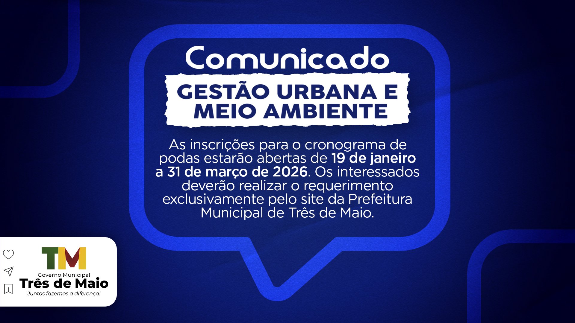 O Governo Municipal de Três de Maio, por meio da Secretaria de Gestão Urbana e Meio Ambiente informa que estão abertas as inscrições para o Cronograma de Podas 2026. O período para cadastro inicia no dia 19 de janeiro e segue até 31 de março de 2026.