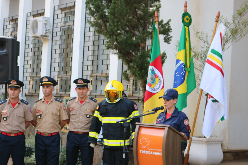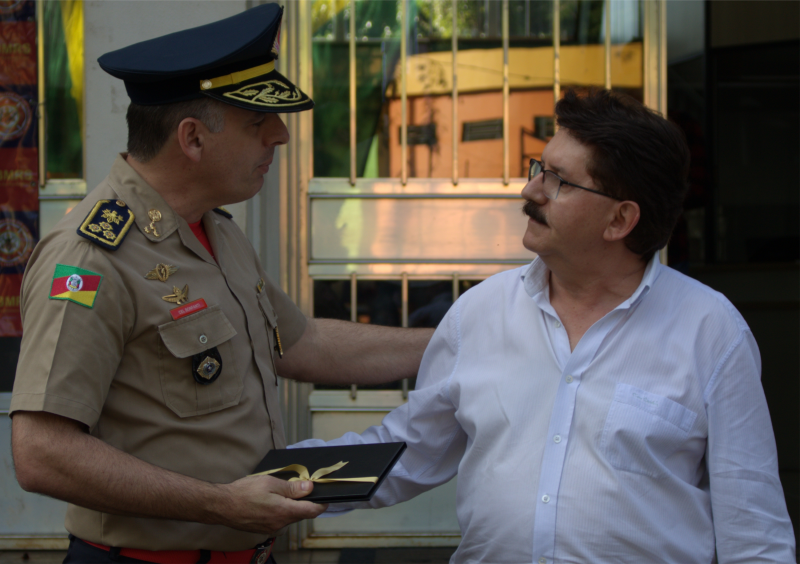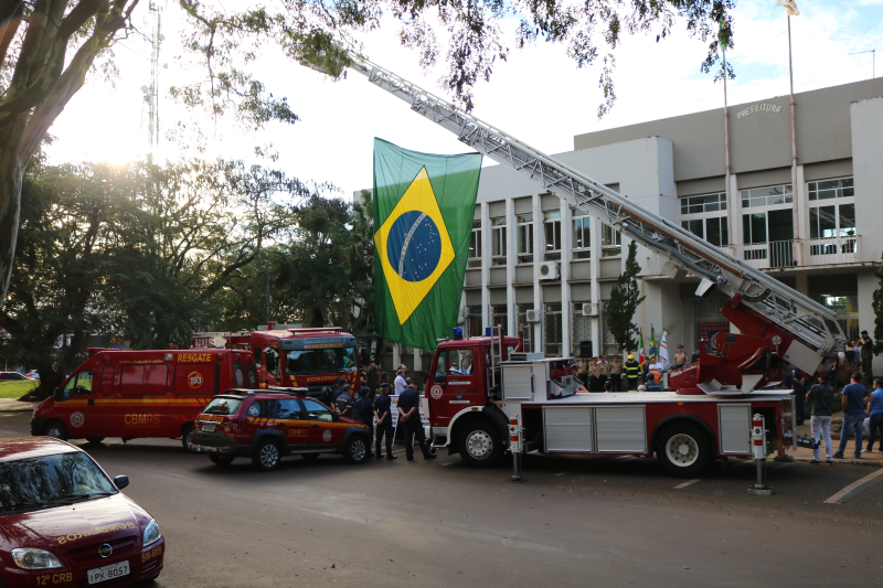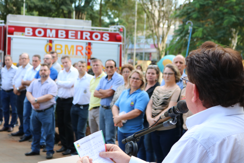 Esteve presente no ato de entrega o comandante geral do Corpo de Bombeiros Militar do RS coronel César Eduardo Bonfanti, que recebeu do prefeito municipal de Três de Maio, Altair Copatti, uma homenagem pelo serviço prestado ao povo gaúcho e em especial aos seus conterrâneos três-maienses.