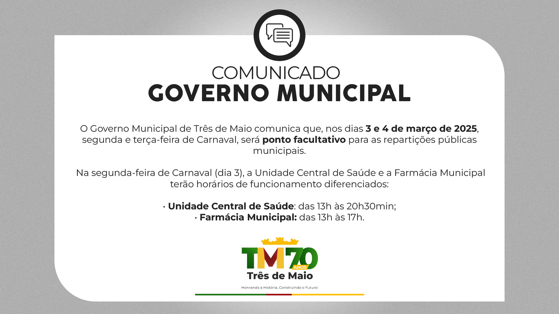 O Governo Municipal de Três de Maio comunica que nos dias 3 e 4 de março de 2025, segunda e terça-feira de Carnaval, serão de ponto facultativo para as repartições públicas municipais.