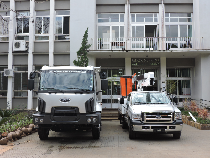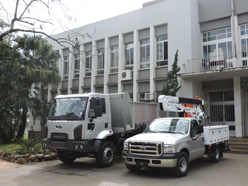 Nesta quinta-feira (17) a Prefeitura recebeu, através da Secretaria Municipal de Obras, dois novos caminhões. As máquinas fazem parte do projeto de renovação da frota do Município e, juntas, somam R$ 520 mil, investidos através de financiamento com o Banco do Brasil/Programa Eficiência Municipal. Os veículos estão expostos em frente ao Palácio Walter Ullmann.