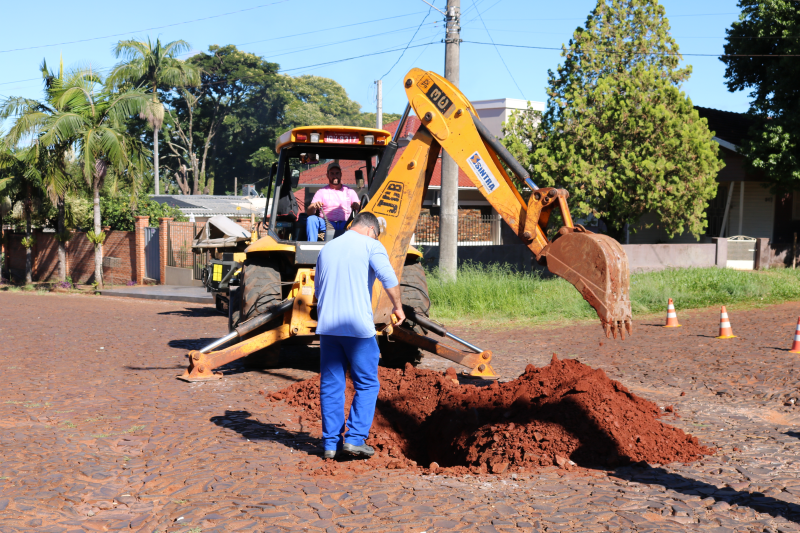 A substituição da rede de água está sendo realizada pela Corsan com apoio da Secretaria de Obras para posteriormente a administração municipal dar início aos trabalhos de asfaltamento na Rua São Paulo.