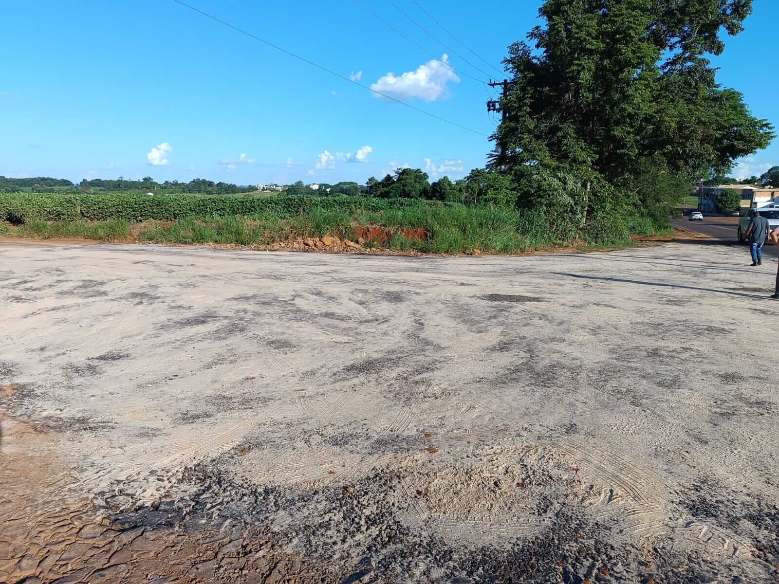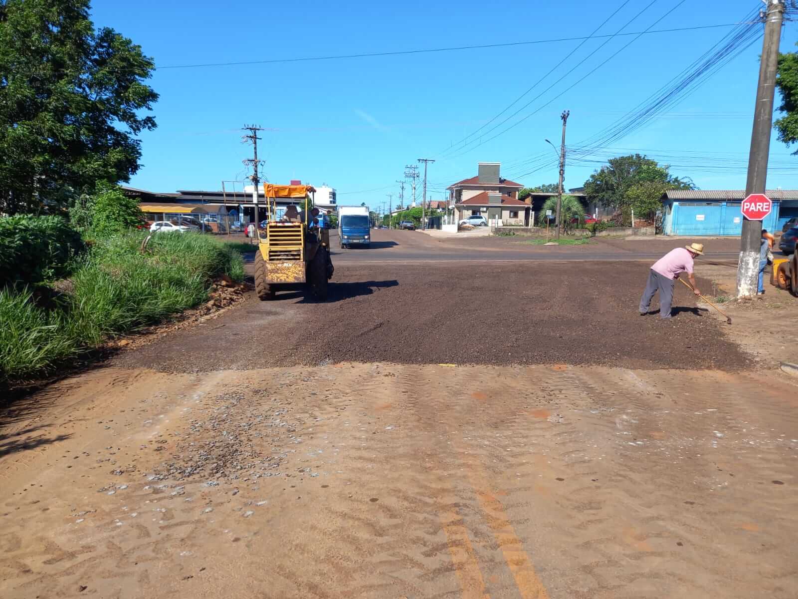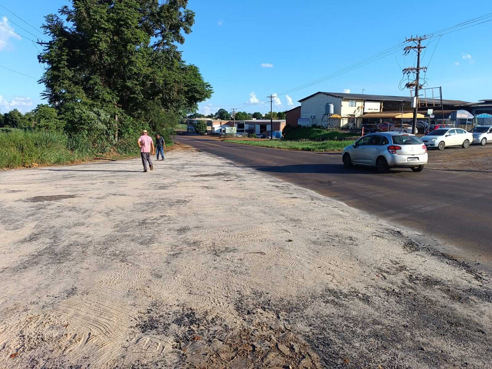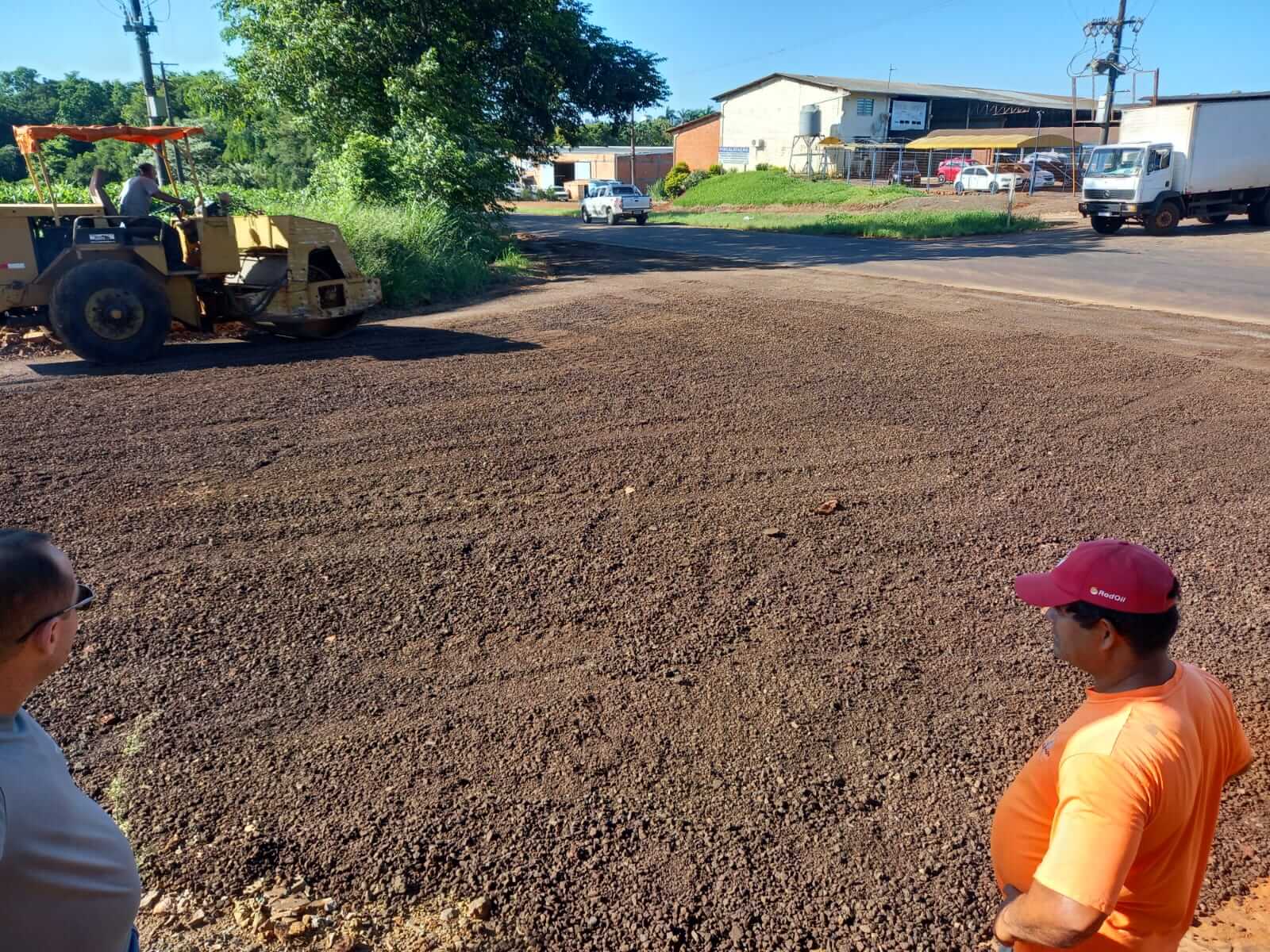 A Secretaria de Obras realizou a colocação de raspas de asfalto, compressão e aplicação de piche, formando uma camada de asfalto na entrada da Área Industrial II.