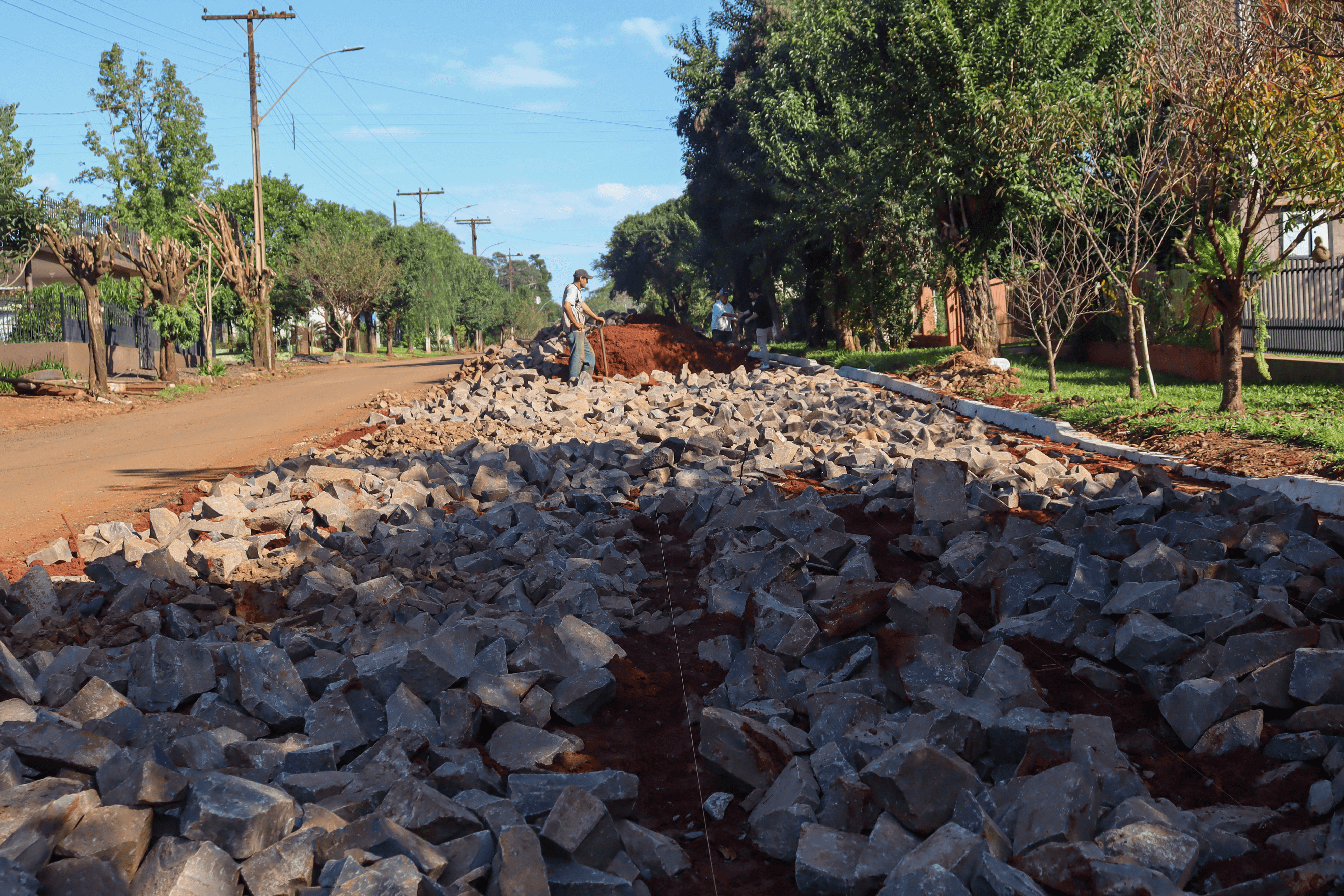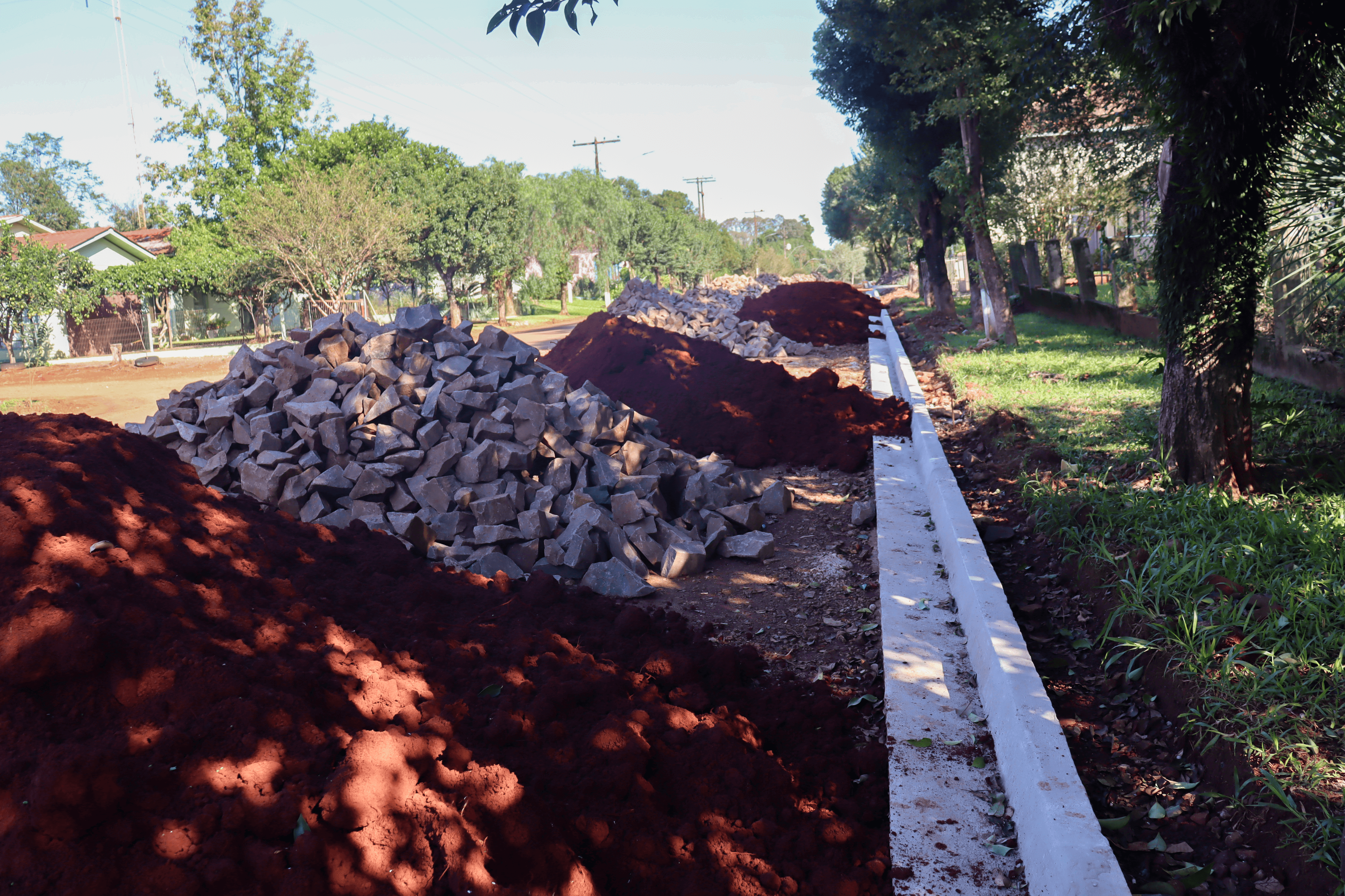 No momento, os meios-fios foram postos e estão realizando a pavimentação. Após a finalização do calçamento, o asfalto existente será revitalizado.
