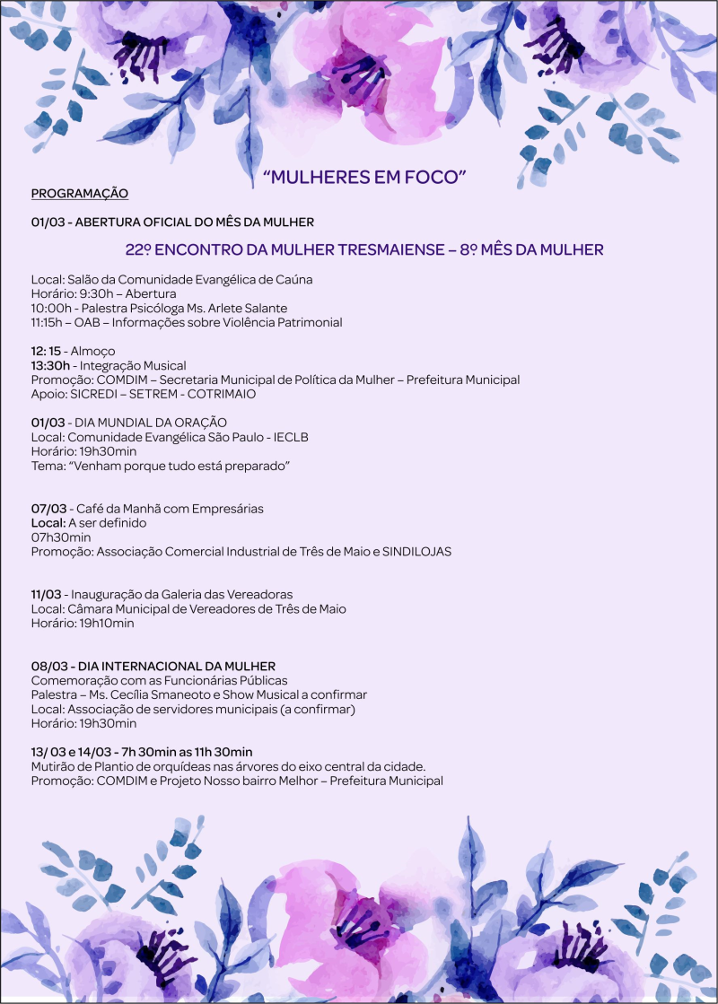 Para comemorar o dia internacional da Mulher, celebrado no dia 8 de março, o Governo Municipal de Três de Maio preparou uma extensa programação. Organizado pela Secretaria de Políticas da Mulher será realizado do dia 1 a 19 de março o 22º Encontro da Mulher Trêsmaiense e 8º Mês da Mulher.