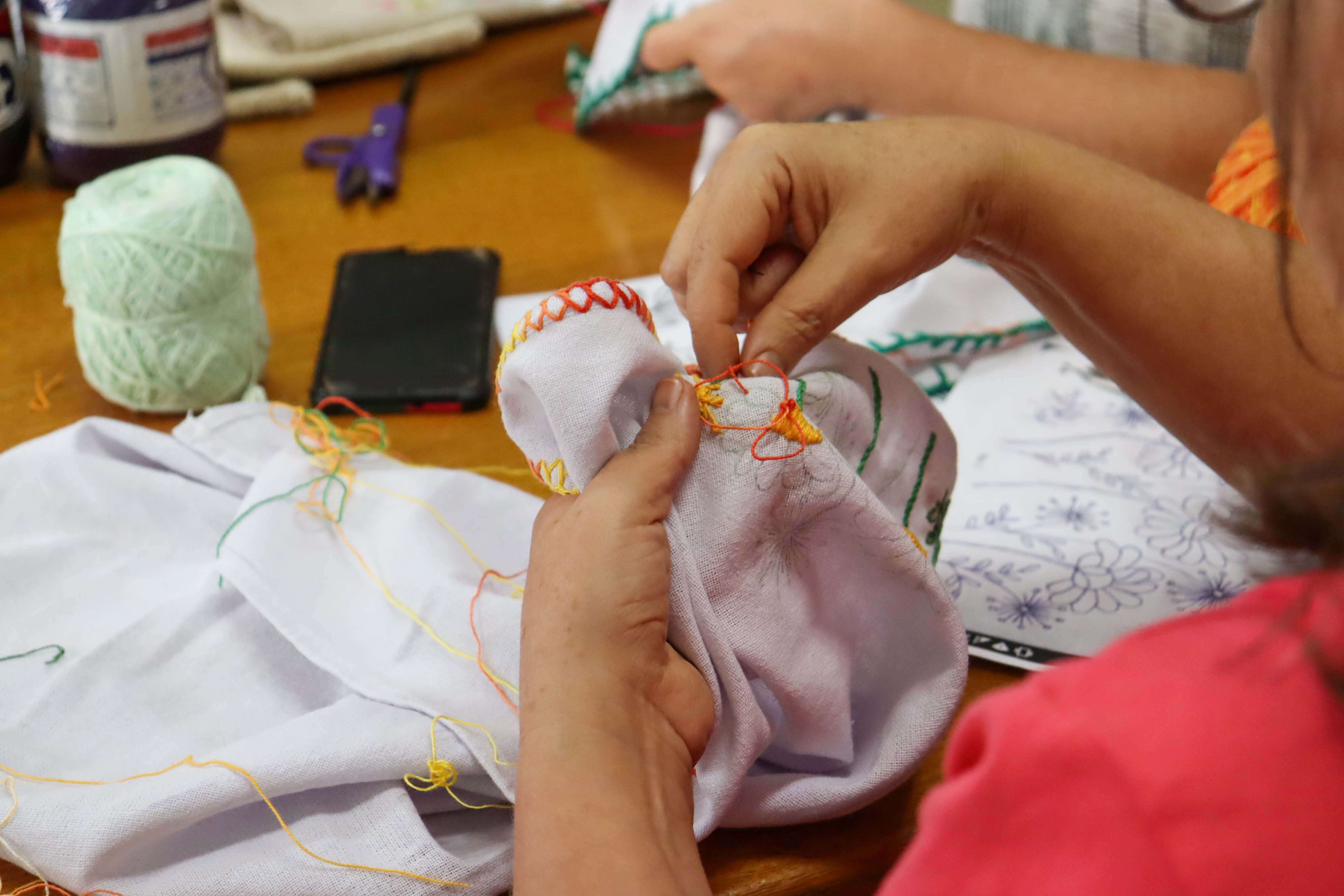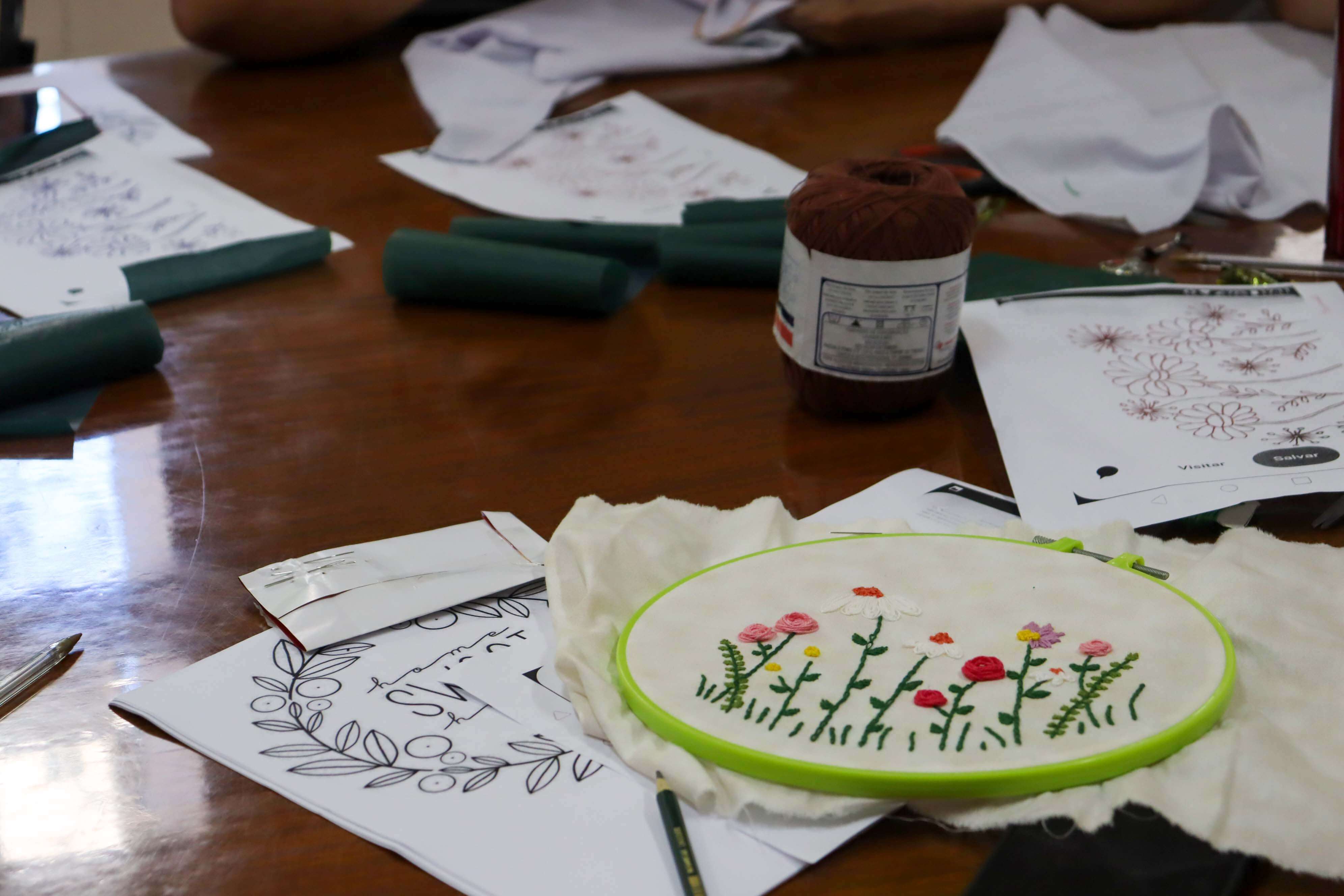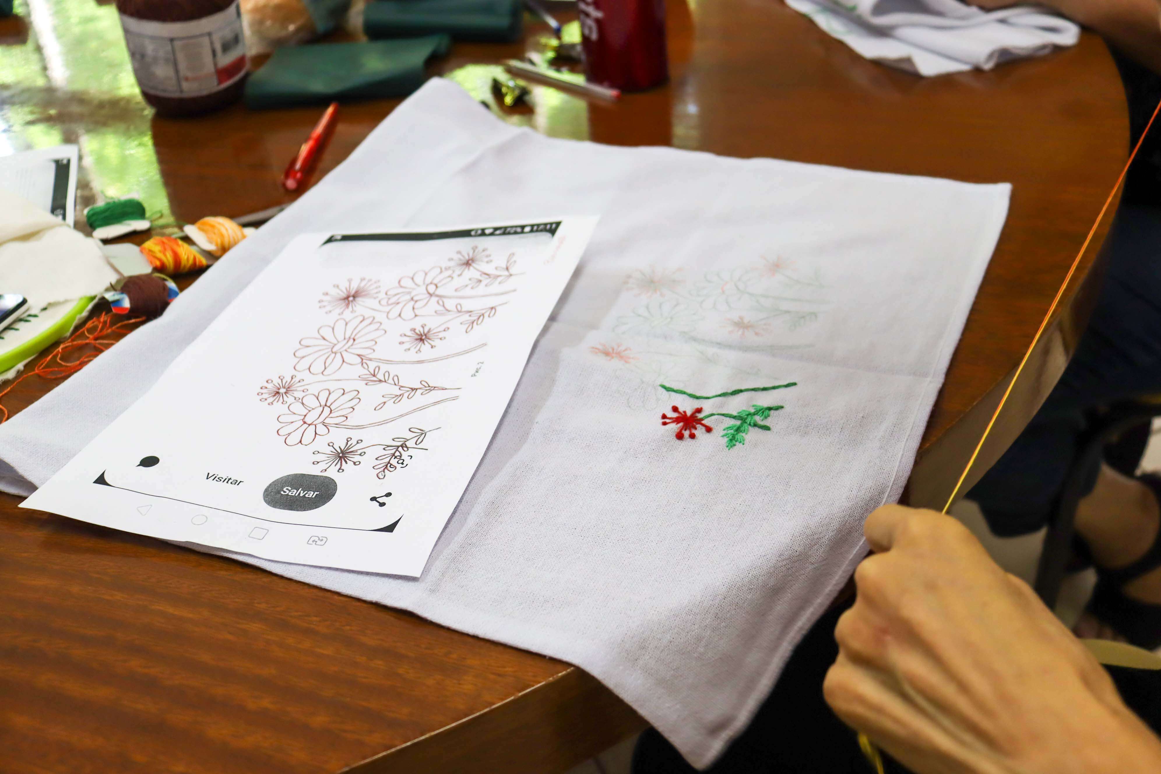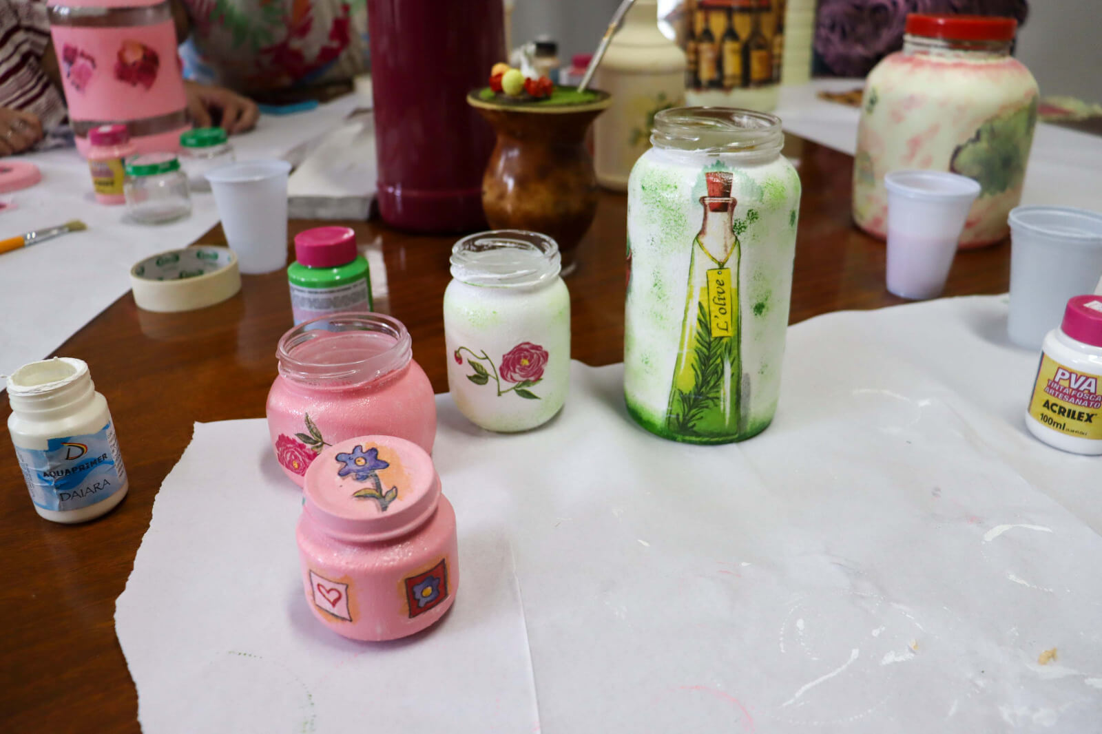 São realizadas atividades de crochê em pano de prato, bordado e decoupage em vidro