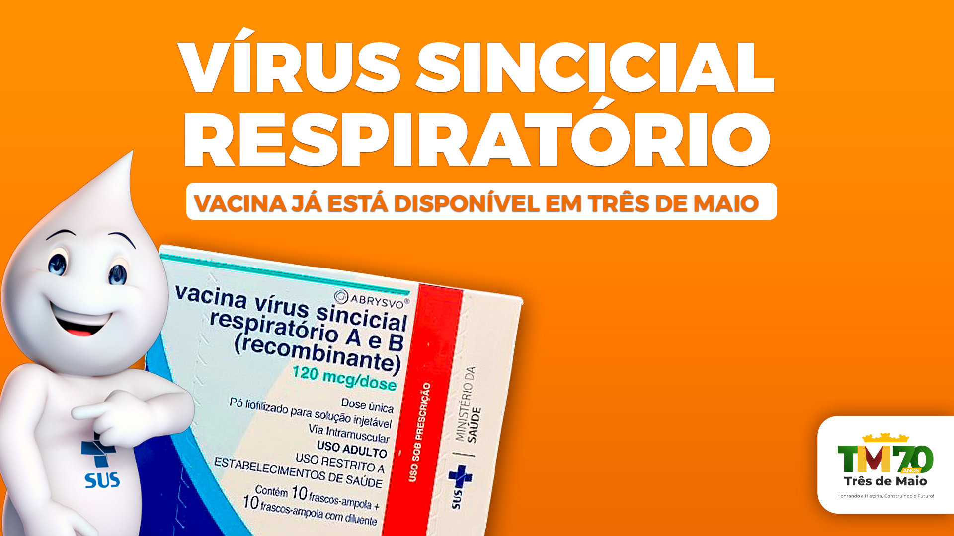 O Governo Municipal de Três de Maio, por meio da Secretaria de Saúde, informa que chegou ao município de Três de Maio a vacina contra o Vírus Sincicial Respiratório, responsável pela bronquiolite e por quadros graves de infecções respiratórias em bebês. A imunização é destinada às gestantes a partir de 28 semanas e já está disponível nas salas de vacina das unidades de saúde.